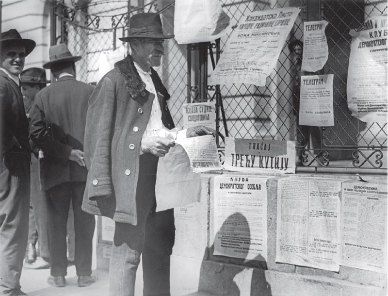Испред гласачког места у II београдској гимназији за време избора 11. септембра 1927. године. Кандидатске листе су истакнуте на огради гимназије у Поенкареовој (данас Македонској) улици.